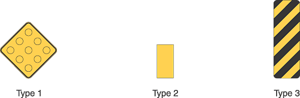 Type 1 is shown as a diamond-shaped yellow sign with nine yellow circles denoting yellow retroreflectors mounted symmetrically in three diagonal rows on the marker. Type 2 is shown as a vertical all-yellow rectangle. Type 3 is shown as a vertical rectangle with diagonal alternating black and yellow stripes. The stripes are at a 45-degree angle beginning at the upper right and slanting down to the left.